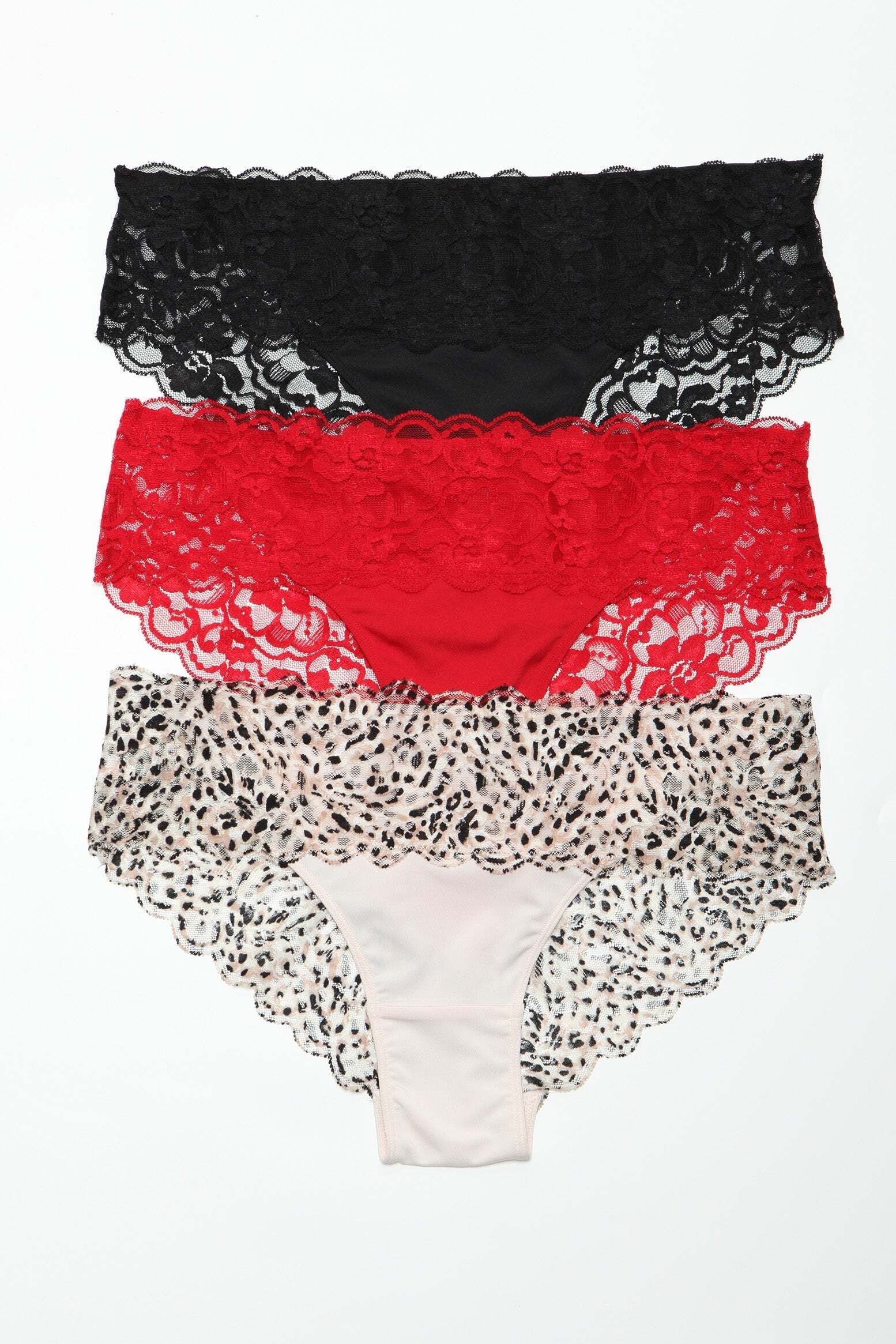 Step into the wild side of comfort with our Arlo Bikini Pack, featuring lace contrast bikini panties that perfectly blend chic sophistication with a touch of exotic flair This collection features solid and animal print sorting Mid-rise Solid and print sorting Lace hem and waist contrast Scallop hem Cotton gusset liner Hanger with Be Wicked hangtag, 3-pack label, size label, hygienic liner, and UPC stickers in a polybag Made in China
