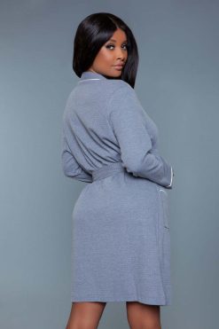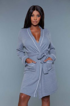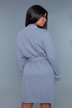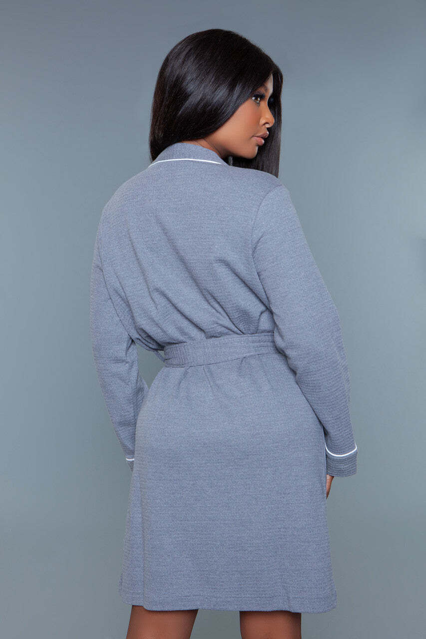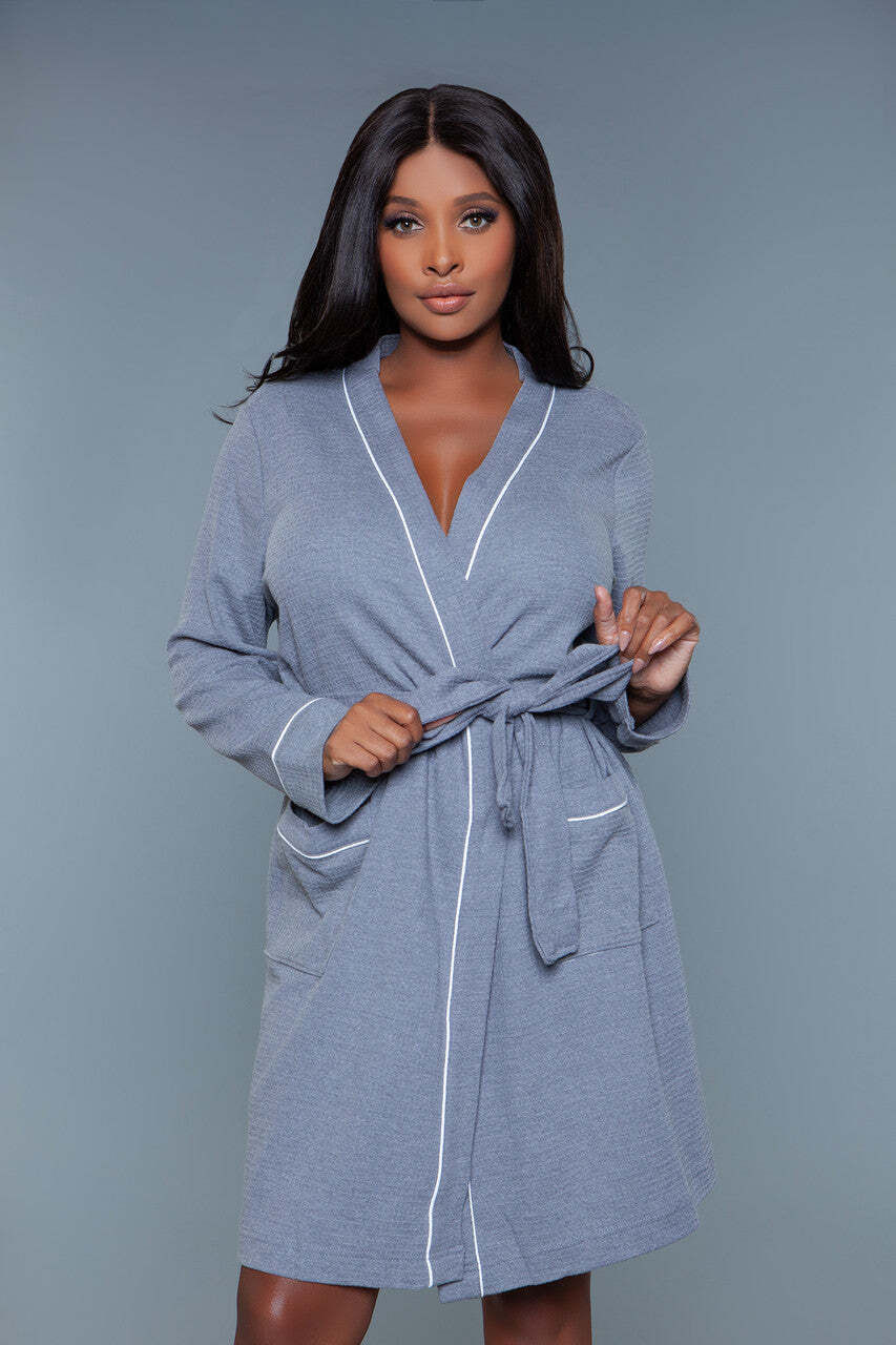 Comfy Waffle Robe Easy fit Color block trim Front tie belt Front patch pockets Polybag packaging with Be Wicked hangtag, and UPC stickers
