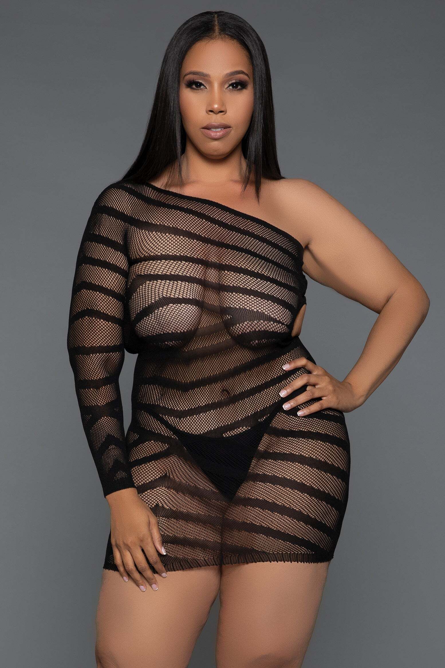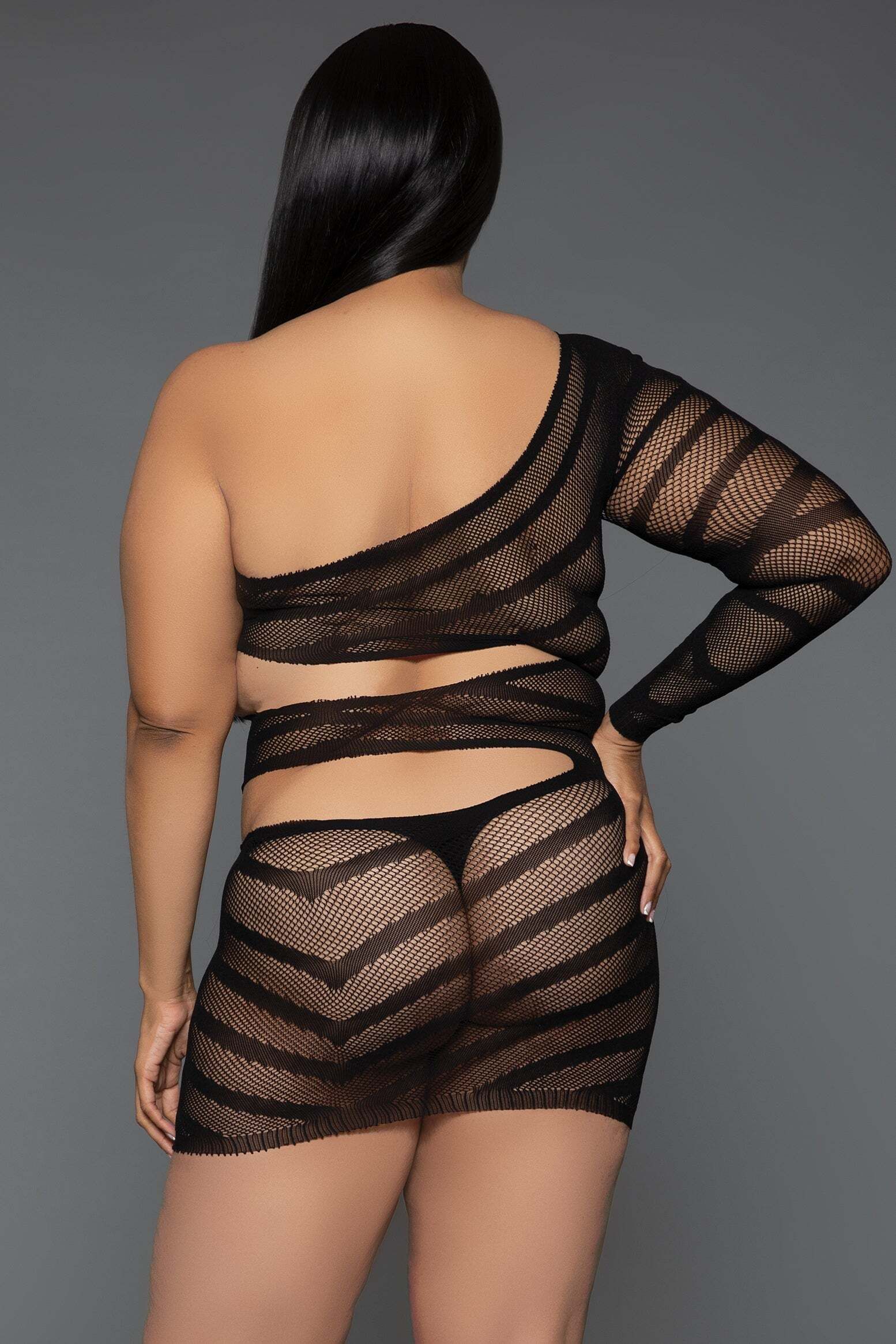 A daring blend of sultry style and playful allure Designed for the fashion-forward individual, this mini dress features bold stripes and strategic cut-outs, making it a standout piece for your lingerie wardrobe One shoulder Long sleeve Alluring side cut out Asymmetrical diagonal stripe pattern Sheer Thong and pasties not included Handwash only Do not bleach/tumble dry/iron/dry clean Be Wicked box packaging Made in Taiwan 92% Nylon 8% Spandex