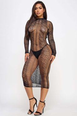 Indulge in temptation with our Gretta Midi Dress, a captivating ensemble that merges the allure of fishnet fabric with the tantalizing allure of cut-out detailing Crafted to command attention, this midi dress is perfect for those who dare to be bold and embrace their sensuality High neckline Long sleeves Fishnet and cut-out contrast Bodycon bodice Thong and pasties not included Made in Taiwan