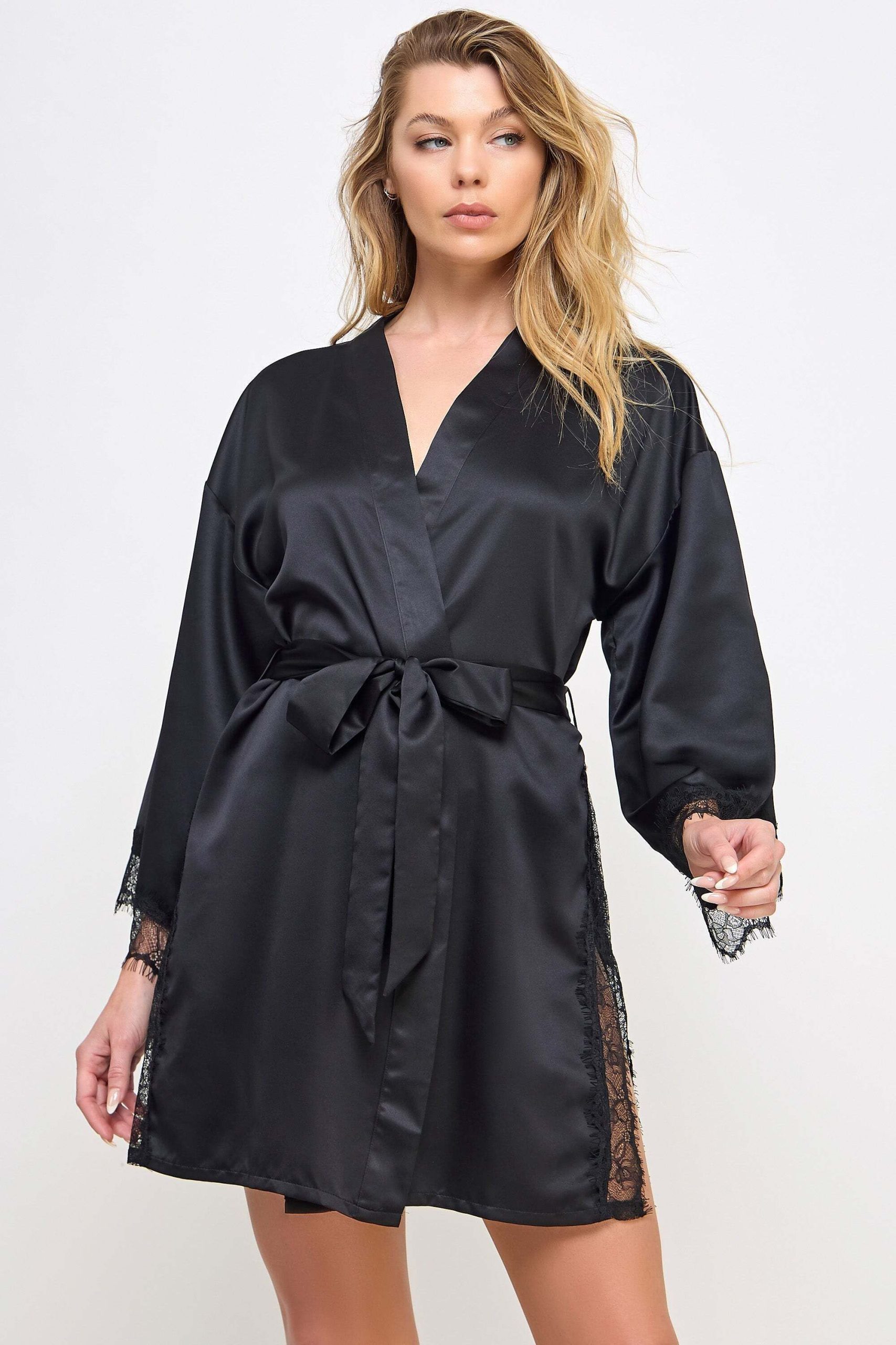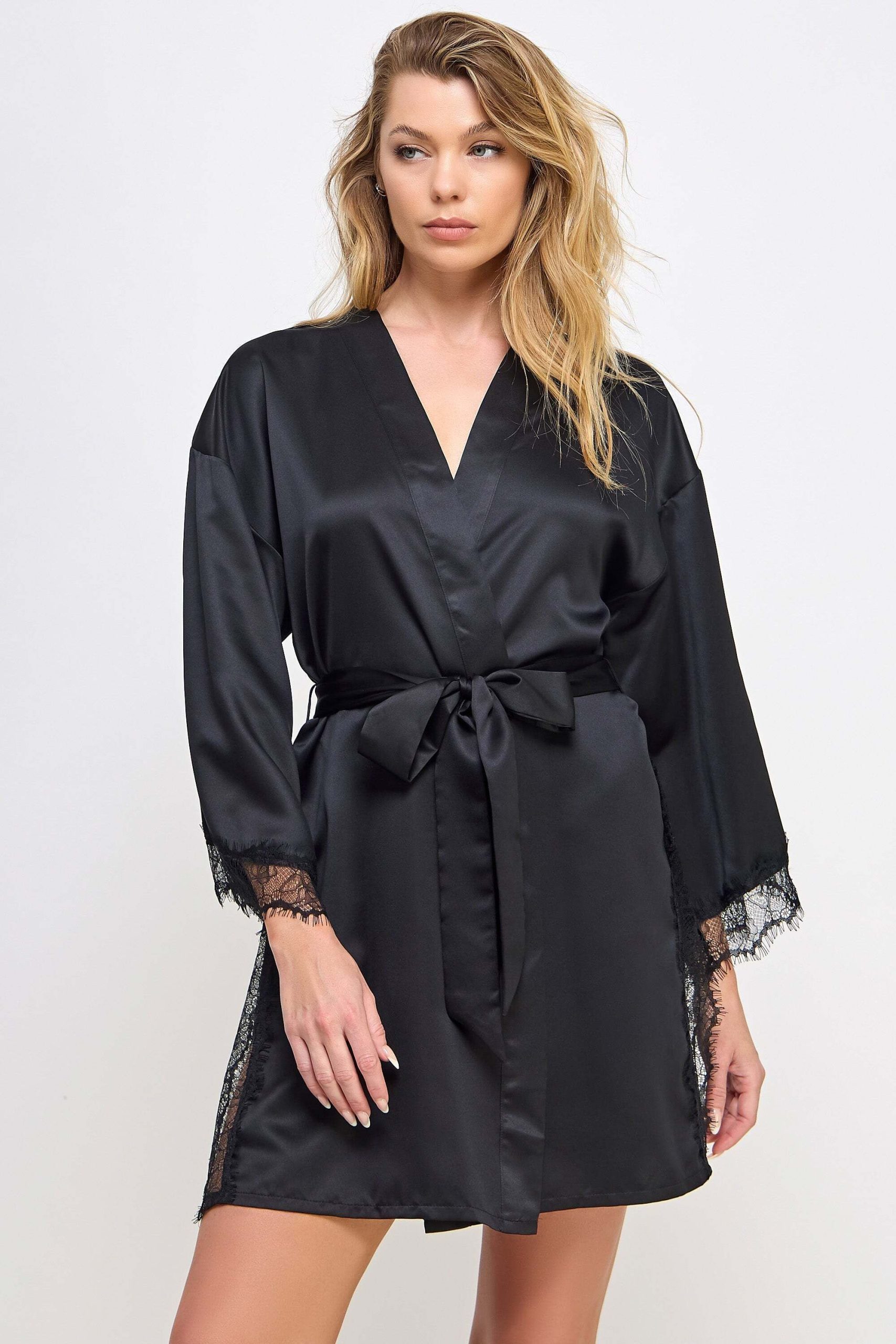 The Gillian Robe is a stunning piece that combines the smooth and luxurious feel of satin with a touch of romantic lace trim This beautifully crafted robe features a sleek, flowing silhouette that drapes gracefully over the body, enhancing its allure Satin bodice and lace trim Long sleeves Satin front tie belt Lace side slits