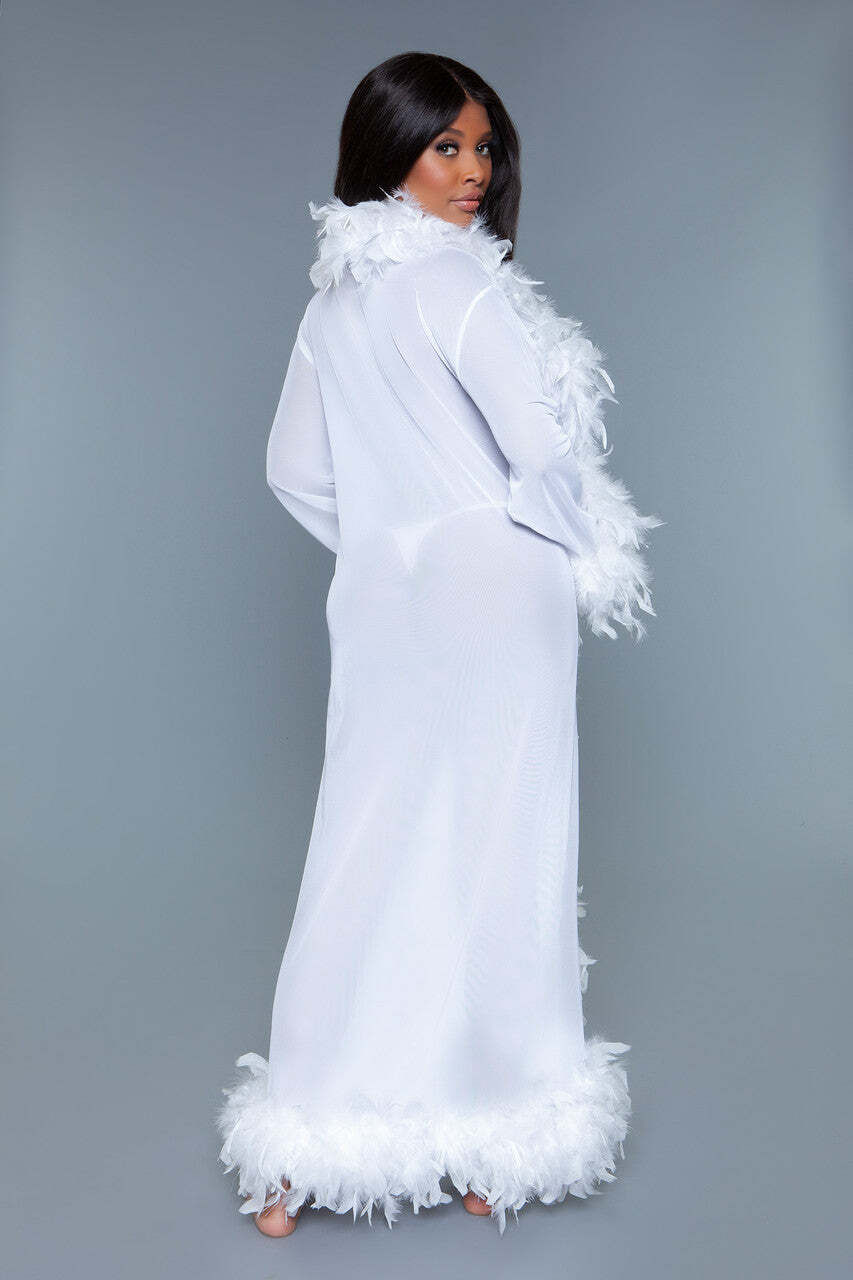Long Glamour chiffon robe with feather boa trim is a playful yet elegant garment that combines the airy lightness of chiffon with the whimsical allure of a feather boa trim For the best look, gently fluff the feathers after opening A few feathers may come loose during unpacking This robe is designed for those who love to add a touch of glamour and fun to their loungewear Sheer Feather trim Long sleeves Thong not included