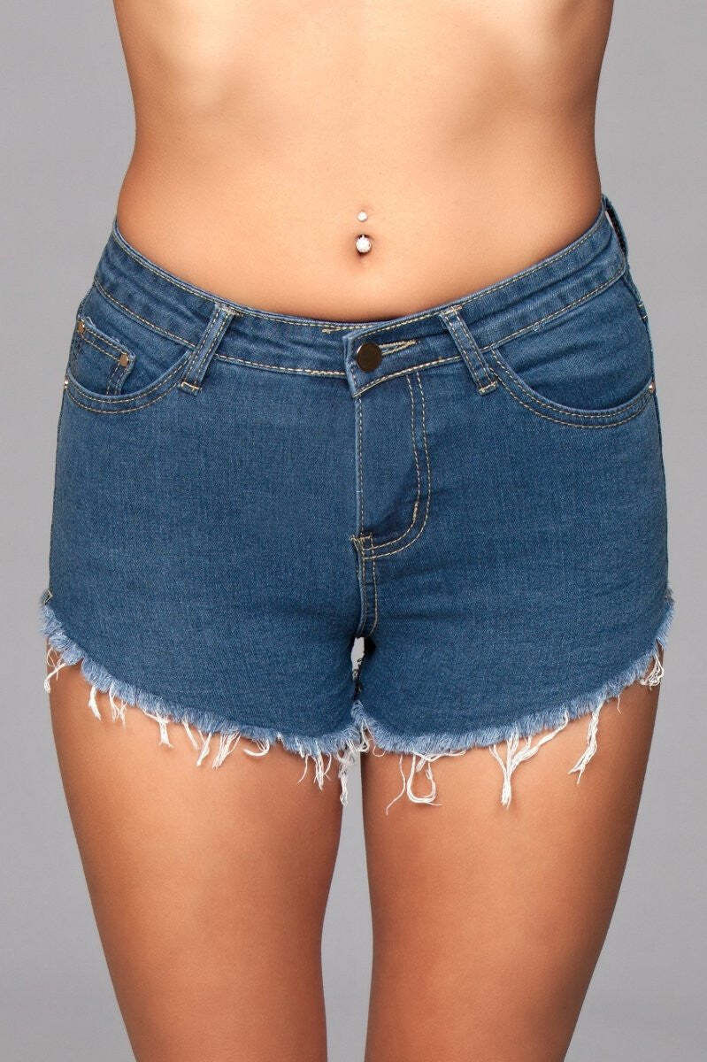Elevate your casual style with these uniquely designed denim shorts, combining classic elements with a modern twist Perfect for those who appreciate a blend of comfort, functionality, and fashion-forward detailing Back zipper detail Front button and zipper closure Front and back pockets High waist Frayed hem Wash separately Professional dry cleaning is recommended