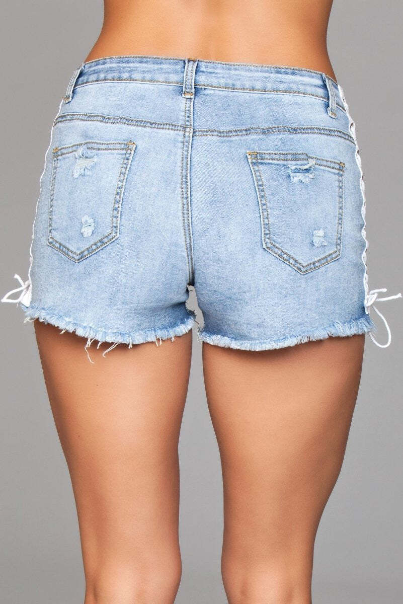 These denim shorts are a bold fusion of rugged distressing and intricate lace-up sides, crafted for those who love to make a statement with their style Great to pair with your favorite swimsuit Light wash Front button and zipper closure Low rise Distressed look Frayed hem Flattering ace-up sides Handwash only